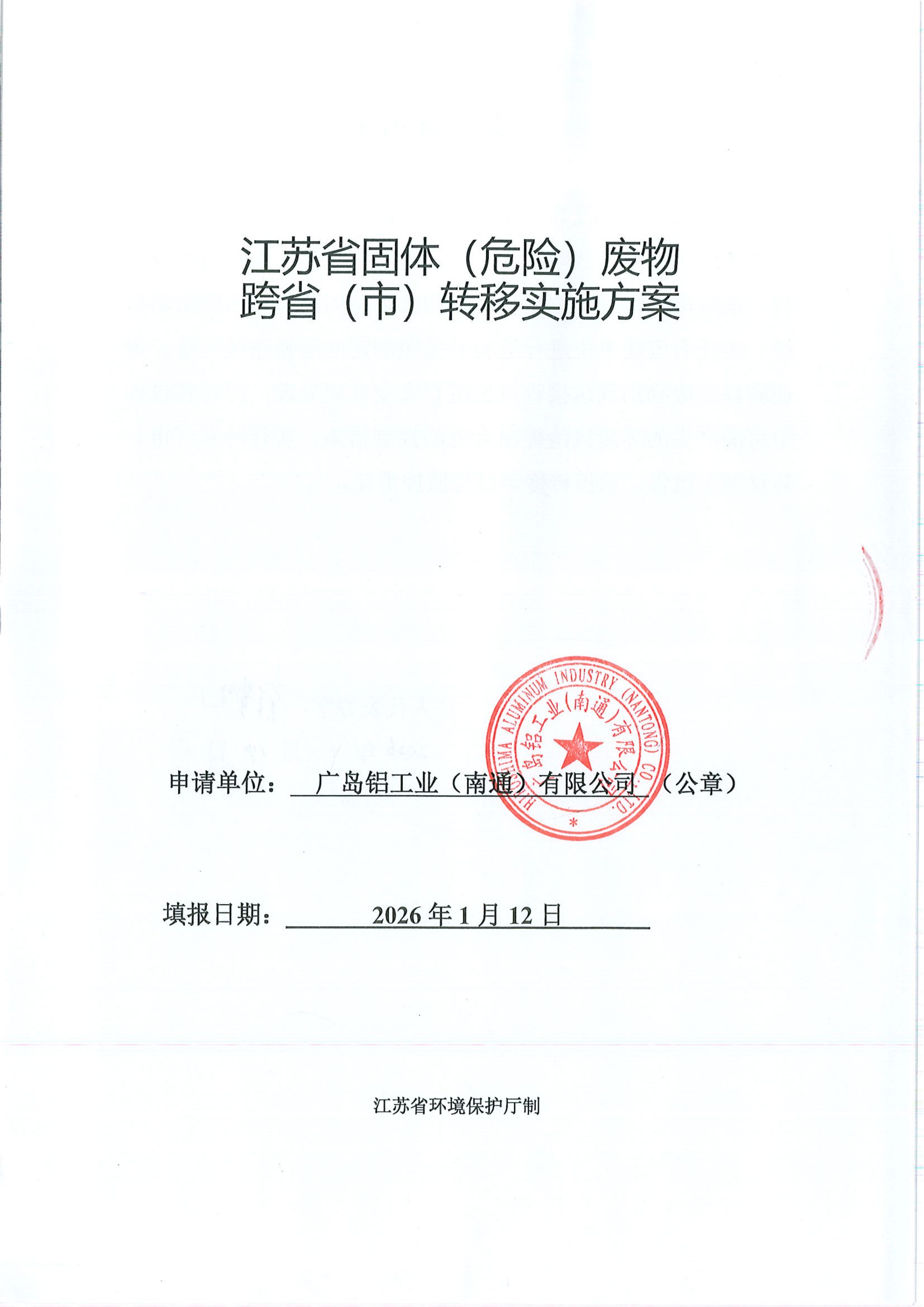 廣島鋁工業(yè)(南通)有限公司固體(危險(xiǎn)廢物)廢物跨省轉(zhuǎn)移實(shí)施方案(2026年計(jì)劃)